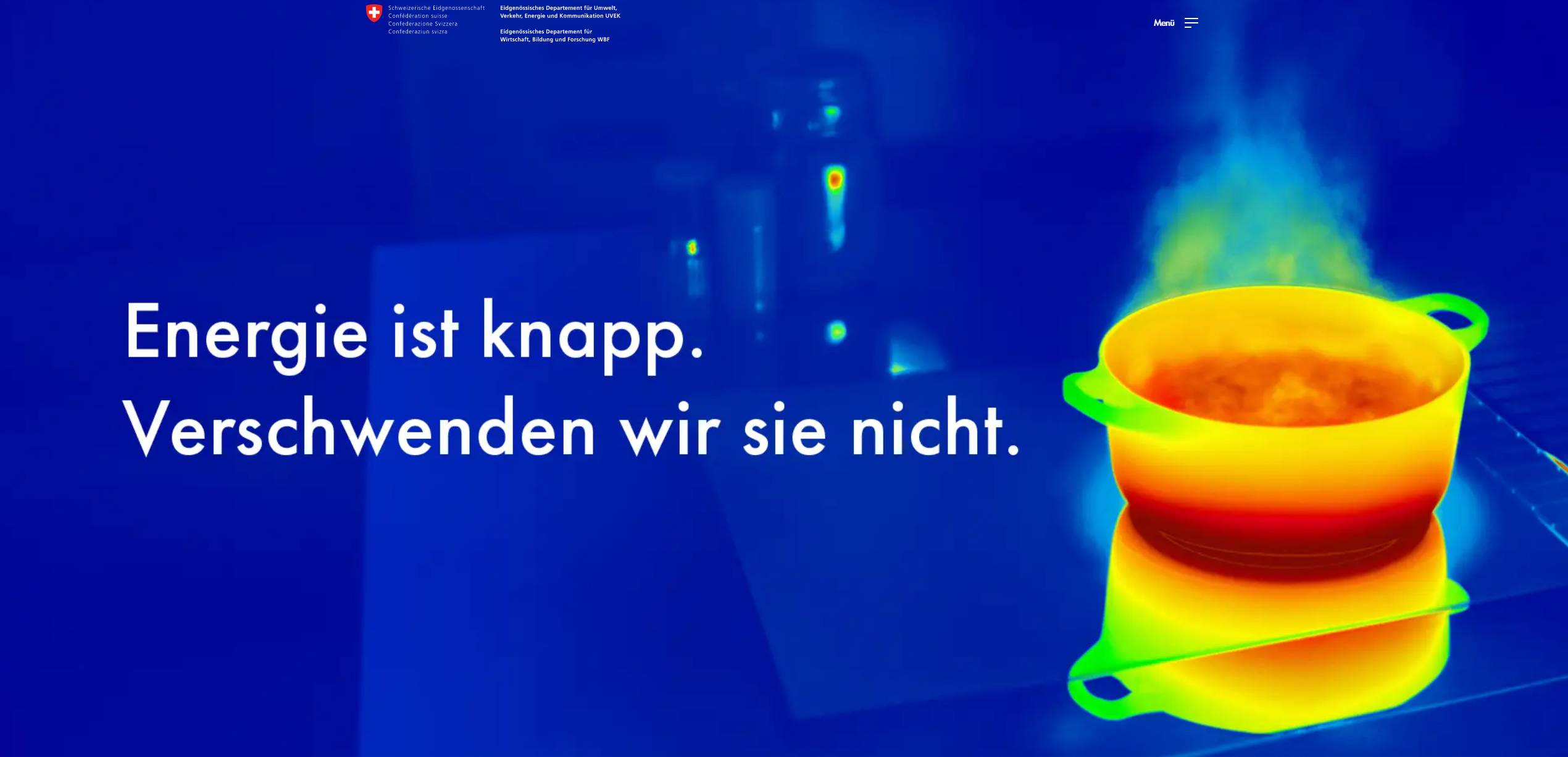 Die aktuelle Situation mit der Versorgungslage hat das Bewusstsein fürs Energiesparen verschärft. UVEK und WBF betreiben die Website nicht-verschwenden.ch und plazieren dort auf der obersten Ebene ein Wärmebild von einem Schmortopf auf einem Induktionsherd: