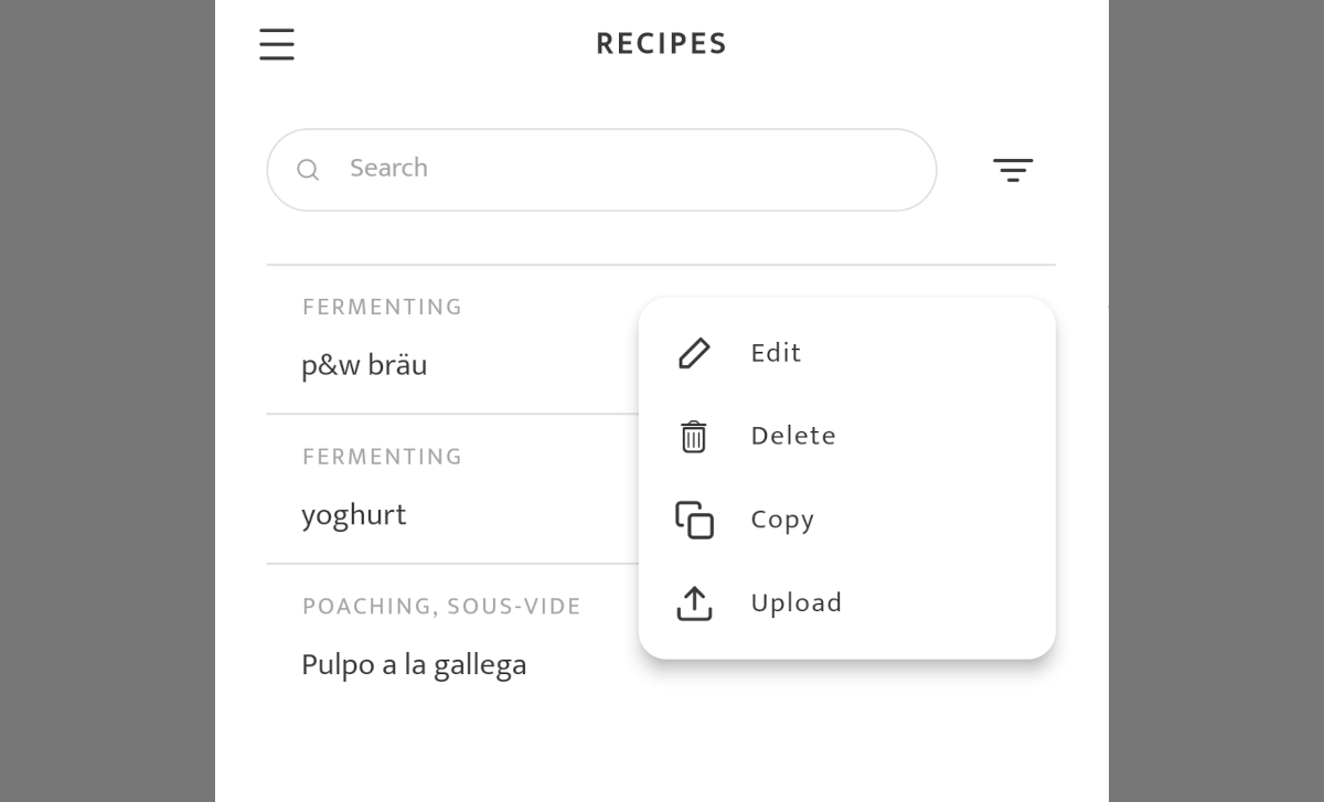 Um ein Rezept veröffentlichen zu können, muss erst eines aus der App hochgeladen werden. Dazu musst du in der App mit demselben Login eingeloggt sein, wie auf der Website (oben). Die Login-Option findet sich unten im Hauptmenü ≡ (sinnigerweise auch 'Hamburger'-Menü genannt).