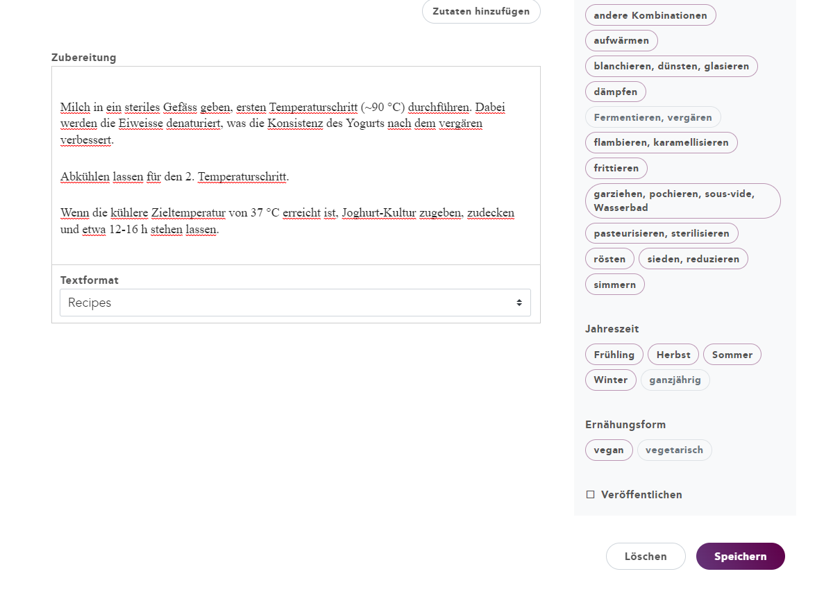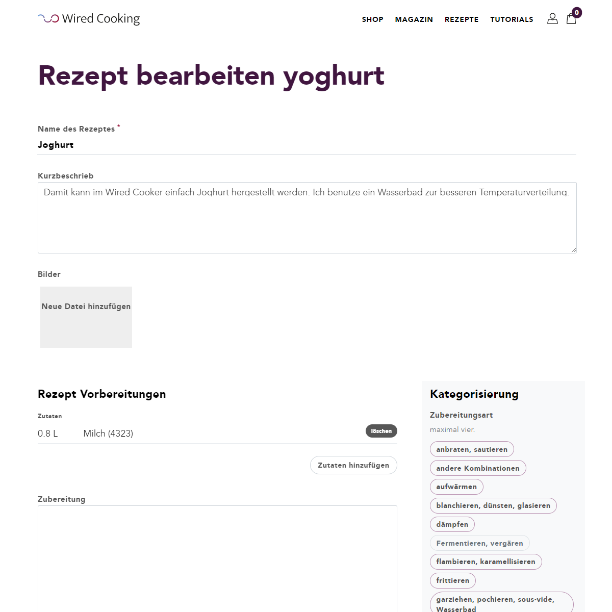 Hier kannst du das Rezept mit den entsprechenden Angaben versehen und ein Bild davon hochladen. Wenn du es noch nicht gleich veröffentlichen möchtest, kannst du es zuerst noch speichern ohne 'veröffentlichen' anzuwählen.