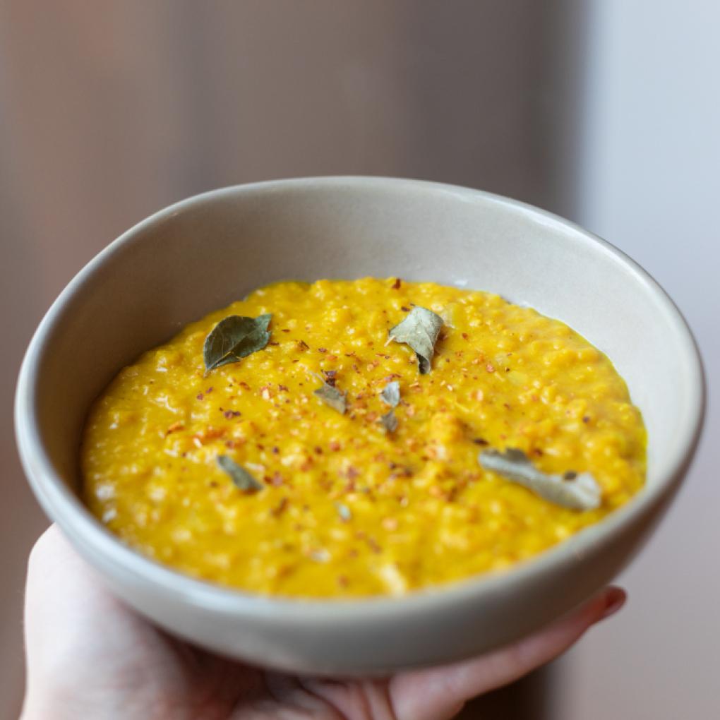 Zur Deko Kokosmilch und Curryblätter hinzugeben, mit Salz und Pfeffer abschmecken.
