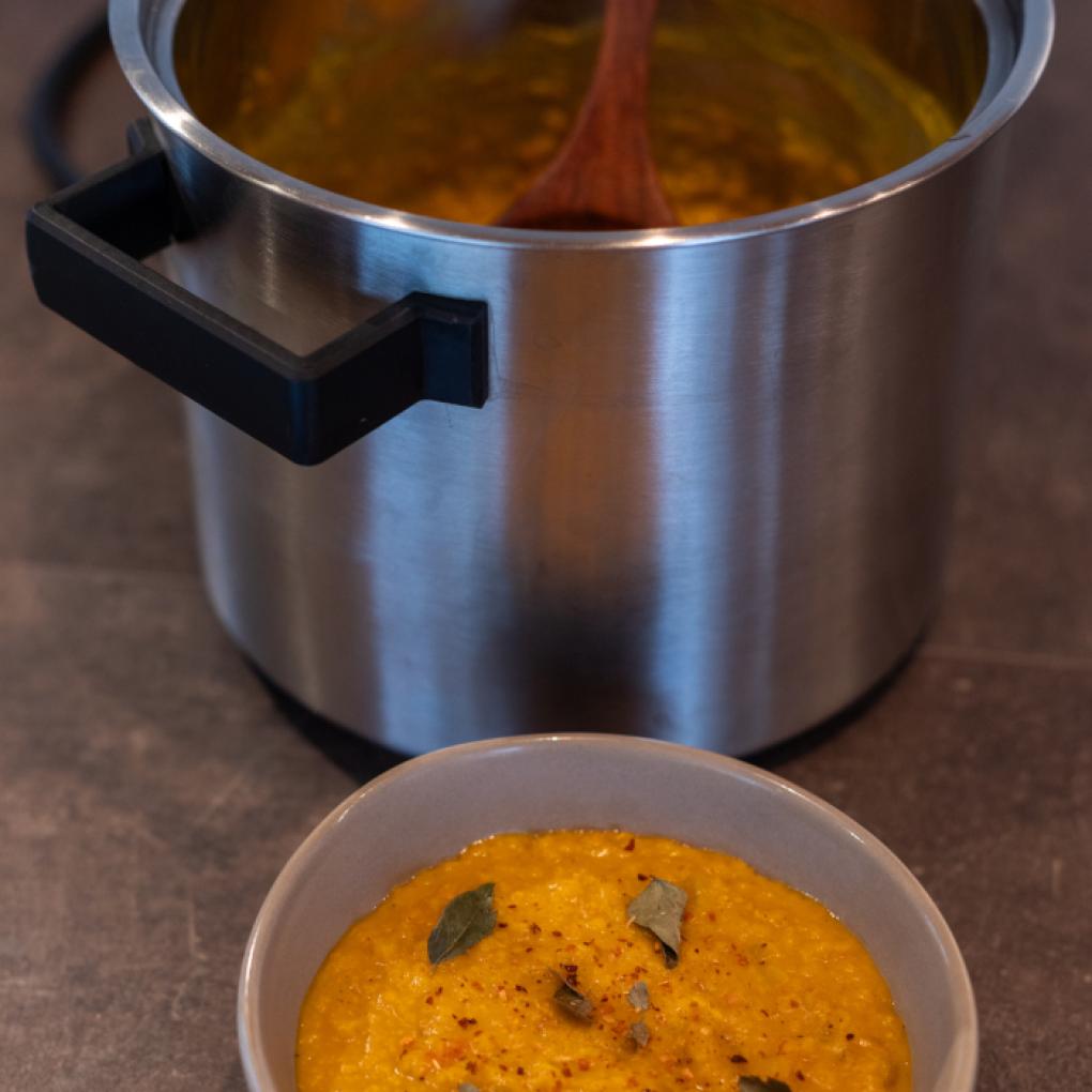 Zwiebeln und Knoblauch schneiden, mit dem Rest in einen Topf geben und die Linsen mit Wasser bedecken, ca. 3-4 cm. Wer Lust hat kann auch zuerst den Knoblauch und die Zwiebeln kurz in etwas Kokosöl anrösten und erst danach Wasser hinzugeben, alles aufkochen und auf schwacher Hitze köcheln lassen.