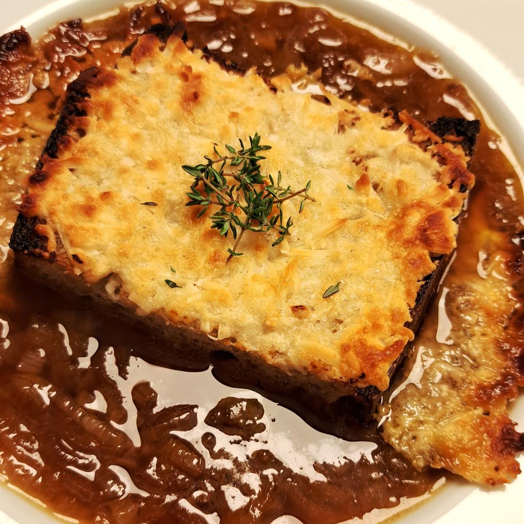 Damit eine Zwiebelsuppe schmeckt wie das original in Frankreich, müssen die Zwiebeln bei nicht zu hoher Temperatur gut geröstet werden. Das braucht etwas Geduld, aber es lohnt sich!