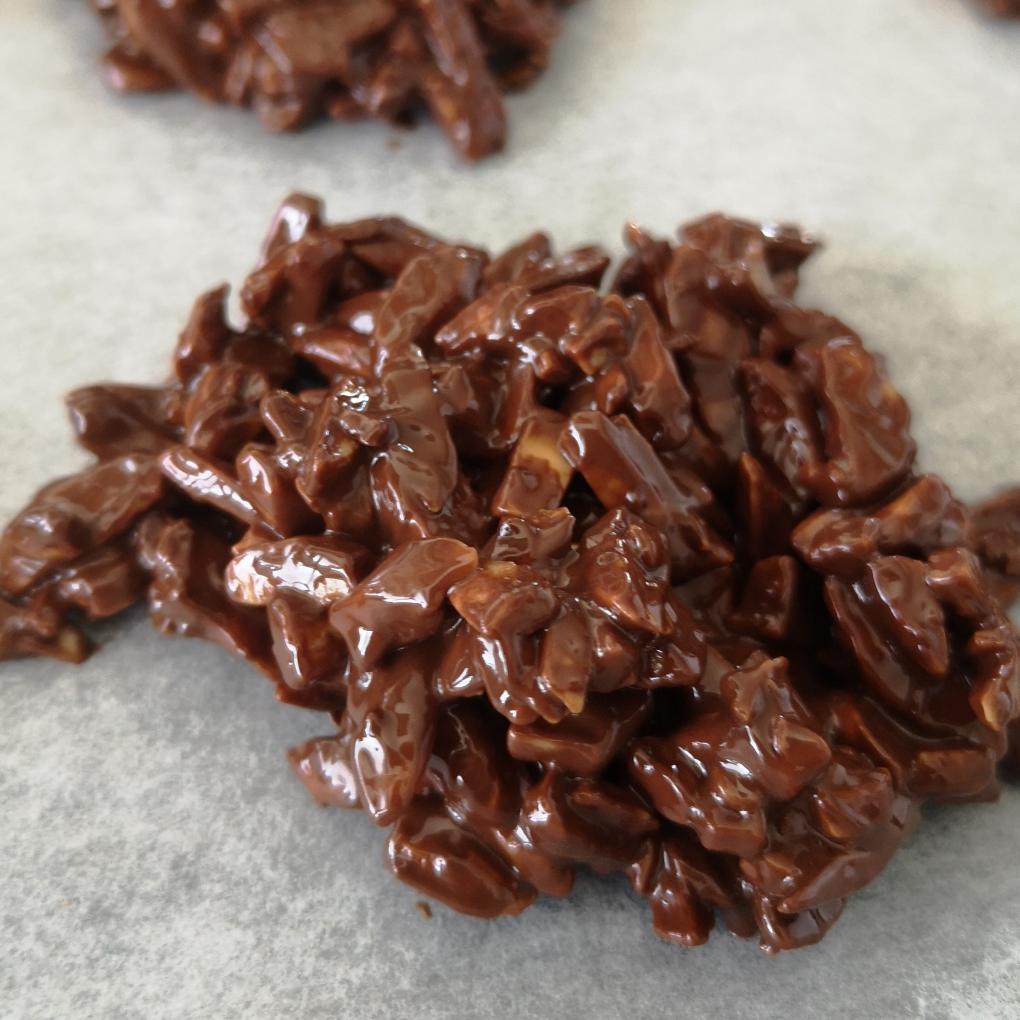 Mandeln dazugeben, kurz umrühren und auf ein Backtrennpapier kleine Häuffchen formen.