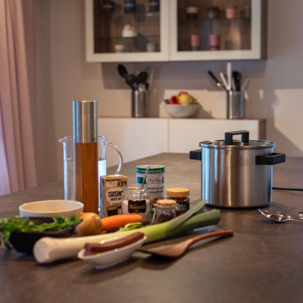 Gemüse und Zwiebeln sowie Knoblauch fein würfeln. Alles in den Topf geben, kurz anrösten in wenig Öl. Wasser und Bouillon hinzugeben. Köcheln lassen für mindestens 25 Minuten.