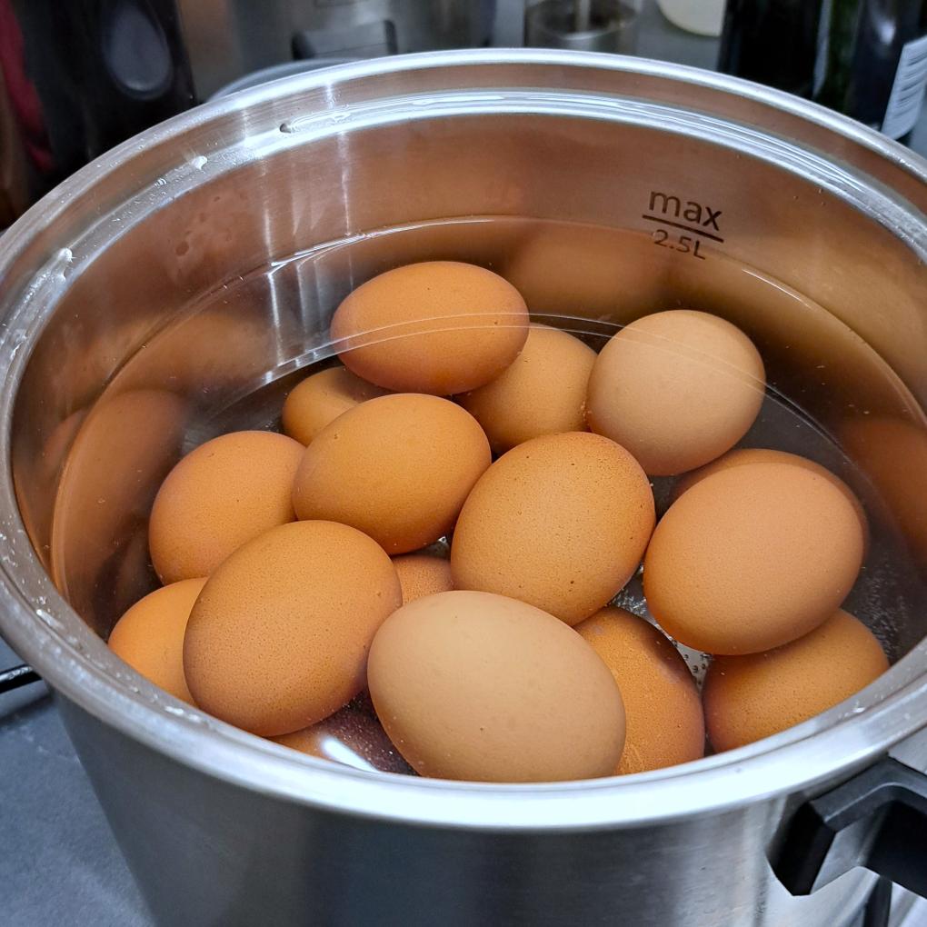 Wasserbad auf 64°C erhitzen und die Eier darin 1 Stunde ziehen lassen. Rausnehmen und in ein warmes Wasserbad aubrechen. Mit Hilfe einer Schaumkelle herausheben, zum Beispiel auf die Sellerie-Espuma (eigenes Rezept) legen, etwas Fleur de Sel und Caviar darübergeben.