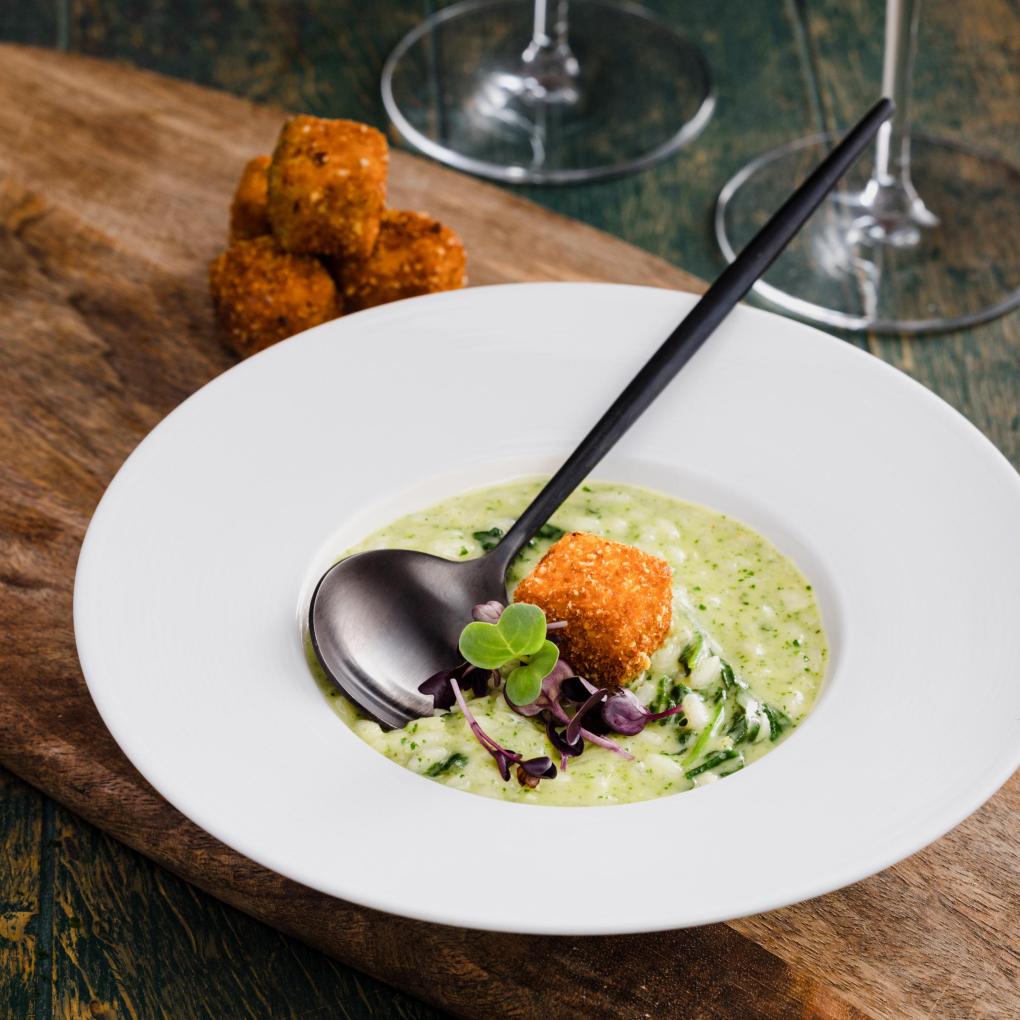 • Gemixten Spinat dazugeben und direkt servieren.