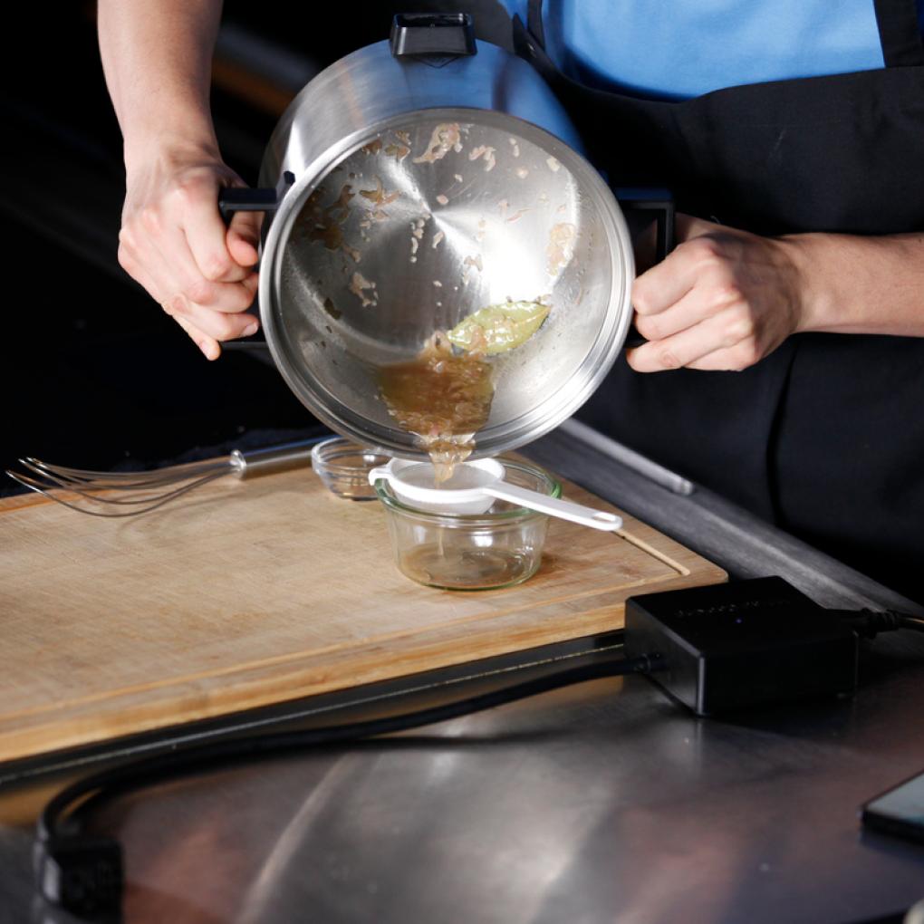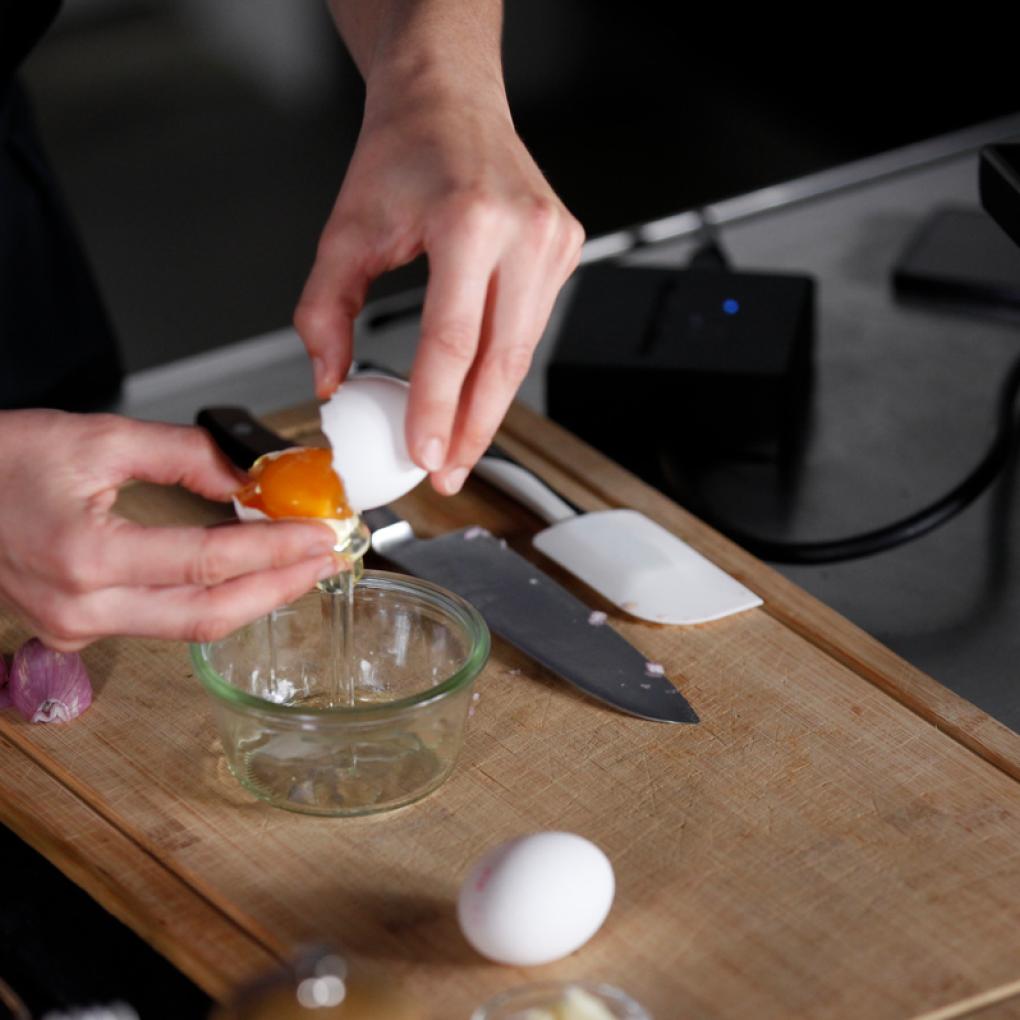 Eigelb mit Handmixer im gekippten Wired Cooker unter die Reduktion rühren und das Programm starten. Alles so lange schlagen, bis es zu einer luftigen, cremigen Masse wird.