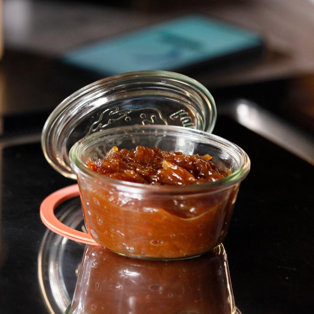 Ein wunderbares Confits (Chutneys) mit Schalotten und karamellisiertem Zucker. In Weck-Gläsern abgefüllt, wird daraus eine haltbare Konserve oder ein überraschendes Geschenk.