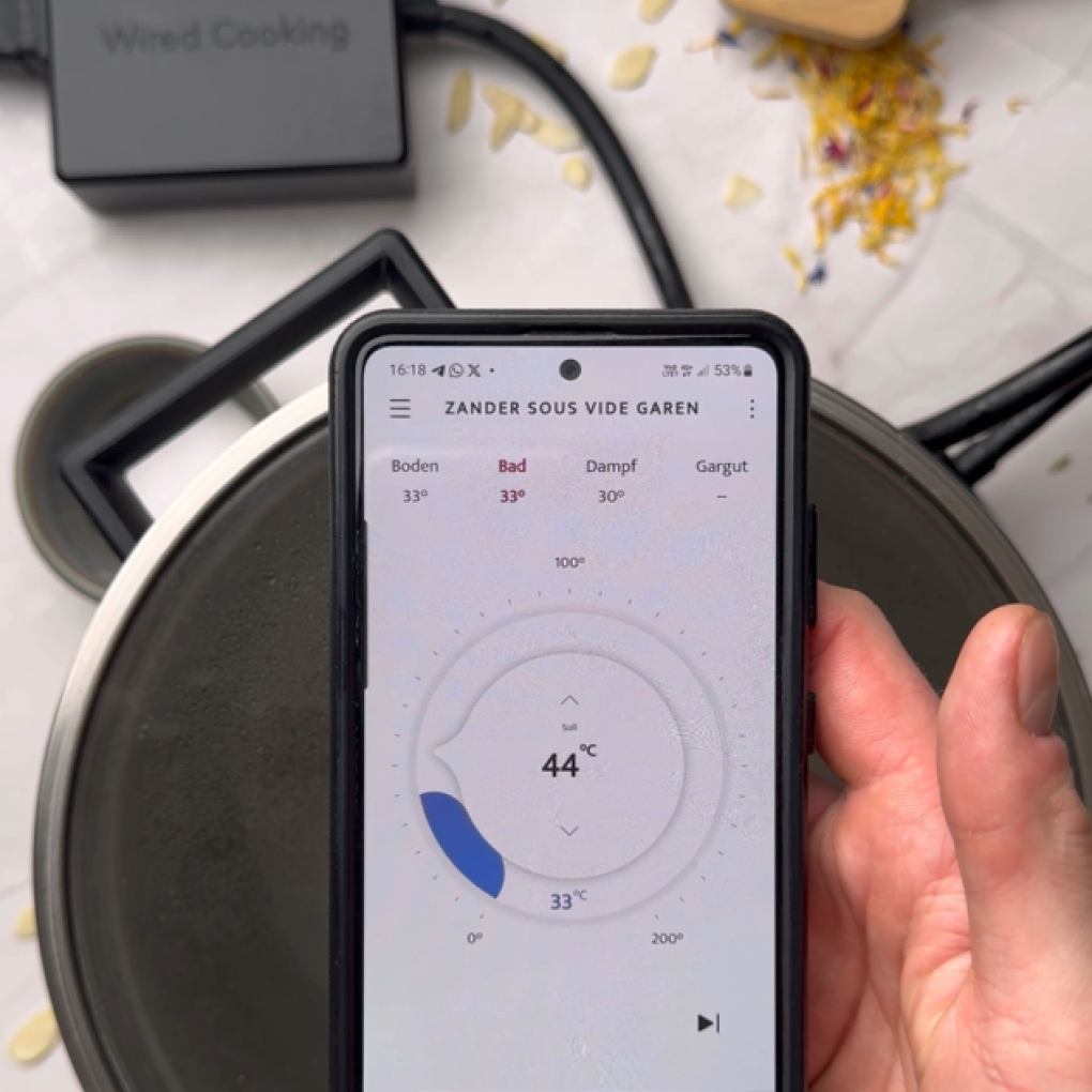 Eine überraschende, aber aussergewöhnlich wohlschmeckende Kombination ist Zander mit Jakobsmuschel. Für perfekte Konsistenz wird der Zander Sous-vide-gegart, während die "Nuss" angebraten wird.
