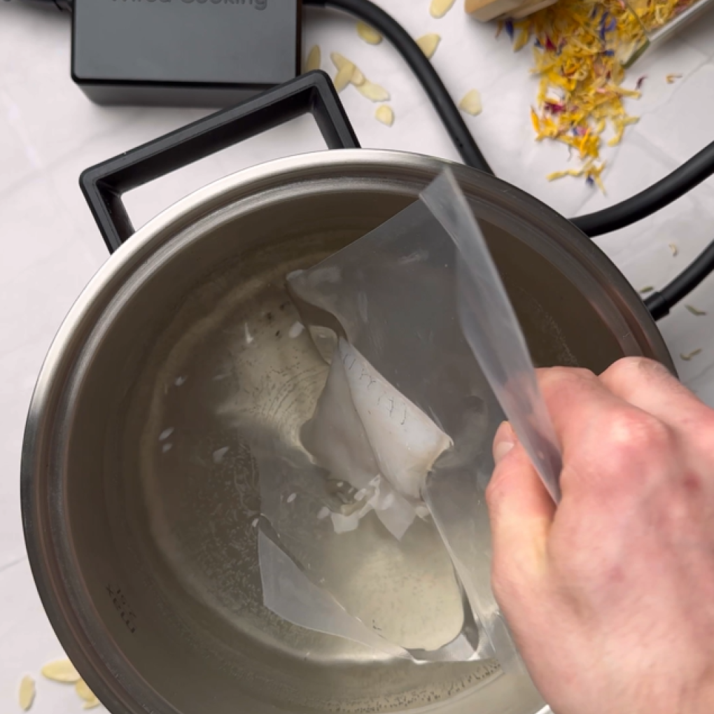 Zanderfilets vakuumieren und bei 44 °C Badtemperatur ca. 30 Minuten Sous-vide-garen. Danach herausnehmen, den Beutel aufschneiden, Zanderfilets herausnehmen und salzen. Mit dem Bunsenbrenner abflämmen und anrichten.