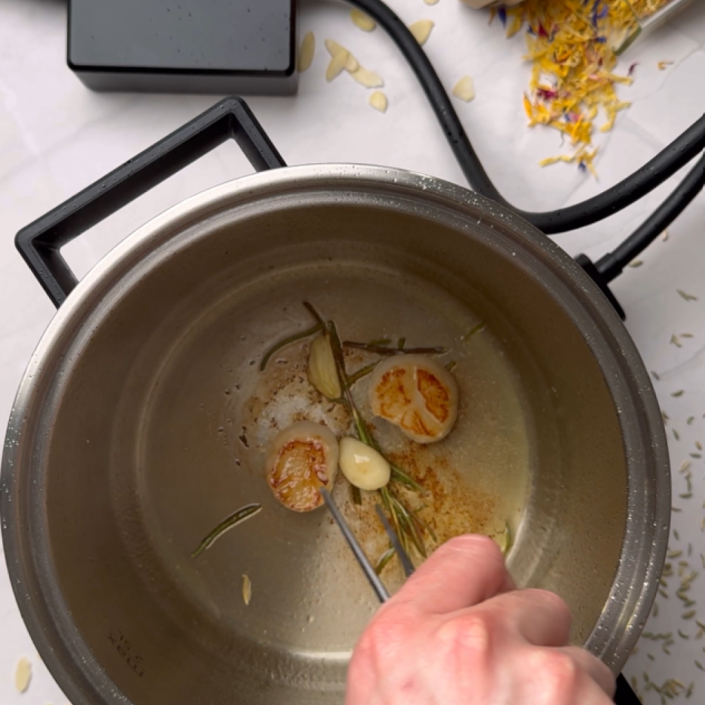 Jakobsmuscheln salzen und in etwas Öl bei 165°C Bodentemperatur anbraten. Angedrückte Knoblauchzehen und Rosmarinzweige beigeben (und eventuell bereits einen kleinen Teil der Butter). Nach 2-minütigem Braten die Jakobsmuscheln herausnehmen und die Mandeln, sowie die restliche Butter beigeben. Die Butter und die Mandelsplitter braun werden lassen.