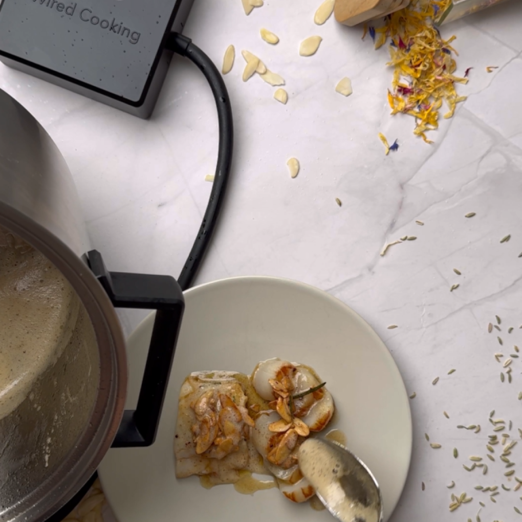 Zander Sous-vide und Jakobsmuschel mit Mandelbutter